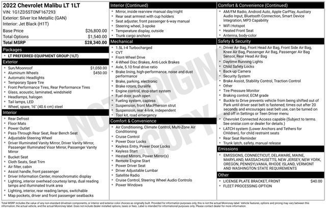 2022 Chevrolet Malibu LT SUNROOF, ONE OWNER, BLUETOOTH, BACK UP CAMERA, HEATED SEATS, GM CERTIFIED WARRANTY AVAILABLE, SATELLITE RADIO, ONSTAR NAVIGATION, APPLE CAR PLAY, SERVICE RECORDS AVAILABLE, 8-Way Power Driver Seat Adjuster, Alloy wheels, AM/FM radio: SiriusXM, Front Bucket Seats, Heated front seats, Power Tilt-Sliding Sunroof, Preferred Equipment Group 1LT, SiriusXM Radio.