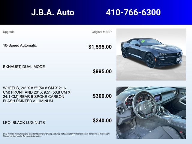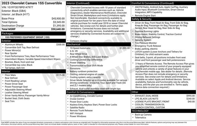 2023 Chevrolet Camaro SS ONE OWNER, BLUETOOTH, BACK UP CAMERA, GM CERTIFIED WARRANTY AVAILABLE, SATELLITE RADIO, ONSTAR NAVIGATION, APPLE CAR PLAY, SERVICE RECORDS AVAILABLE, 6-Way Power Front Passenger Seat Adjuster, 8-Way Power Driver Seat Adjuster, Alloy wheels, AM/FM radio: SiriusXM with 360L, Exterior Parking Camera Rear, Front Bucket Seats, Front Sport Bucket Seats, Power convertible roof, Power driver seat, Power passenger seat, Preferred Equipment Group 1SS, Remote Vehicle Starter System, SiriusXM w/360L.