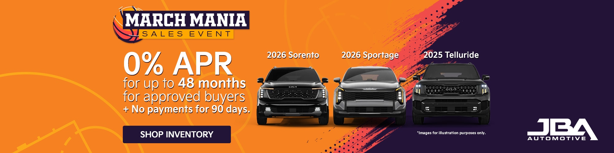 0% SPECIAL FINANCING OFFER FOR APPROVED BUYERS. ALL 26 SORENTO, 26 SPORTAGE, 25 TELLURIDE. 0% APR FOR 48 MONTHS, 90 DAYS TO FIRST PAYMENT. OFFER AVAILABLE FOR QUALIFIED BUYERS ONLY. NOT ALL DISCOUNTS AND RATES ARE COMPATIBLE. $20.83 PER $1,000 FINANCE ON APPROVED CREDIT. SEE DEALER FOR DETAILS. OFFER ENDS 03/31/2026.