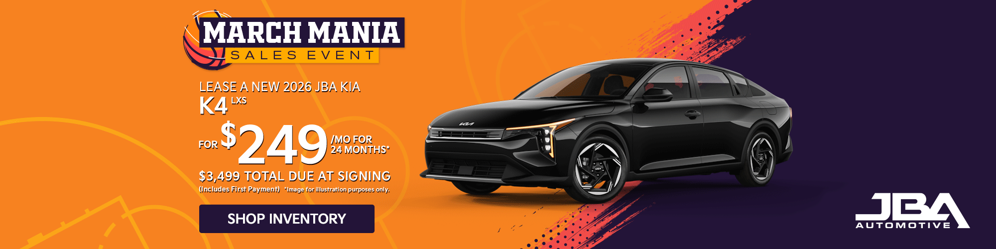 *2026 KIA K4 LXS. Stock# K60380, DEAL #114218, $249 PER MONTH LEASE, $3,499 TOTAL DUE AT SIGNING (INCLUDES FIRST PAYMENT), LEASE FOR 24 MONTHS, 10,000 MILES PER YEAR. PLUS TAX, TAGS. SOME RESTRICTIONS MAY APPLY. $0 SECURITY DEPOSIT DUE. SEE DEALER FOR DETAILS. OFFER ENDS 03/31/2026.