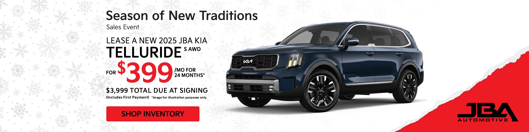 *2025 KIA TELLURIDE S AWD STOCK K51270, DEAL# 114221, $399 PER MONTH LEASE, $3,999 TOTAL DUE AT SIGNING (INCLUDES FIRST PAYMENT), LEASE FOR 24 MONTHS, 10,000 MILES PER YEAR. PLUS TAX, TAGS. SOME RESTRICTIONS MAY APPLY. $0 SECURITY DEPOSIT DUE. SEE DEALER FOR DETAILS. OFFER ENDS JANUARY 2, 2026.