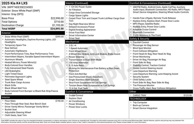 Experience the difference with the 2025 Kia K4 LXS. This exceptional sedan offers a winning combination of style, performance, and cutting-edge technology, all at an unbeatable value. Visit our showroom today and discover why the Kia K4 LXS should be your next automotive companion.