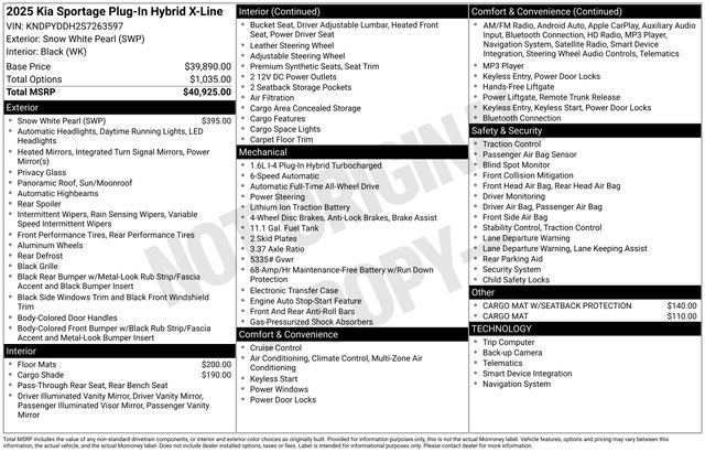 Snow White Pearl 2025 Kia Sportage Plug-In Hybrid X-Line AWD 6-Speed Automatic I4 Some rebates listed may require customer to finance through preferred lender, see dealer for details, Price includes: $2000 - KFA Dealer Choice Program: $2000 discount and 5.25% APR for 36 months. $30.08 per $1000 financed. Available to well qualified buyers who finance through Kia Finance America. 506. Exp. 12/01/2025