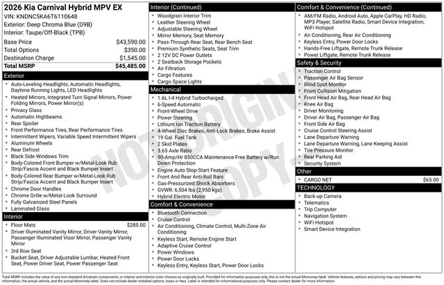 This exceptional 2026 Kia Carnival Hybrid EX is available now at our dealership. With its exceptional features, outstanding performance, and unbeatable value, it's the perfect choice for discerning buyers who demand the best. Don't miss your chance to experience the ultimate in family-friendly luxury. Visit us today and let us show you why the Carnival Hybrid EX is the perfect addition to your lifestyle.