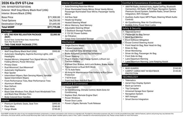This exceptional 2026 Kia EV9 GT-Line is priced at $65,515, a remarkable value considering its extensive list of premium features and capabilities. Don't miss the opportunity to experience the future of electric SUVs. Schedule a test drive today and discover the exceptional performance, technology, and style that the EV9 GT-Line has to offer. Some rebates listed may require customer to finance through preferred lender, see dealer for details, Price includes: $10000 - Kia Customer Cash. Exp. 03/31/2026