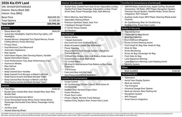 Ebony Black 2026 Kia EV9 Land AWD 1-Speed Automatic Electric Some rebates listed may require customer to finance through preferred lender, see dealer for details, Price includes: $10000 - Kia Customer Cash. Exp. 12/01/2025