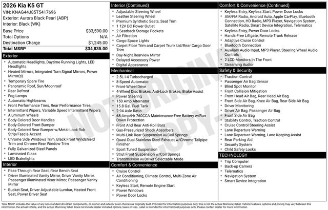 Don't miss your chance to experience the thrill of driving this remarkable vehicle. Visit our showroom today and let us demonstrate why the Kia K5 GT is the ultimate choice for the discerning car buyer. Some rebates listed may require customer to finance through preferred lender, see dealer for details, Price includes: $1000 - KFA Dealer Choice Program: $1000 discount and 5.25% APR for 36 months. $30.08 per $1000 financed. Available to well qualified buyers who finance through Kia Finance America. 506. Exp. 03/31/2026