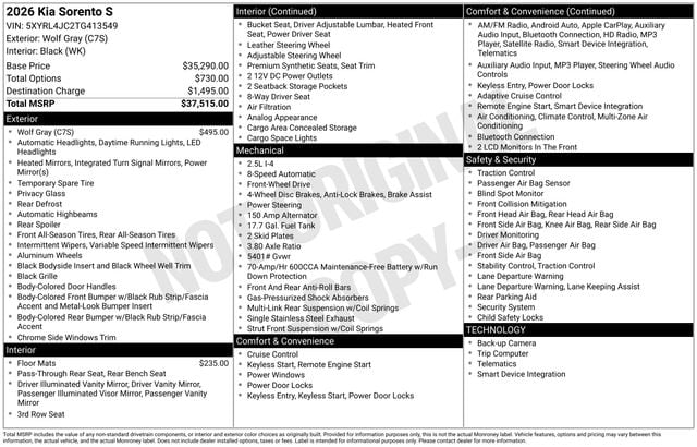 With its striking exterior design, impressive performance, and comprehensive list of features, the 2026 Kia Sorento S is a true standout in the competitive SUV market. Experience the difference for yourself and schedule a test drive today. This exceptional vehicle won't be on our lot for long, so don't miss your chance to make it your own.