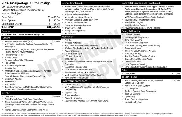 Experience the ultimate in style, performance, and technology with the 2026 Kia Sportage X-Pro Prestige. Visit our showroom today and let us demonstrate why this exceptional SUV is the perfect choice for your next adventure. Some rebates listed may require customer to finance through preferred lender, see dealer for details, Price includes: $2000 - KFA Dealer Choice Program: $2000 discount and 5.25% APR for 36 months. $30.08 per $1000 financed. Available to well qualified buyers who finance through Kia Finance America. 506. Exp. 05/04/2026