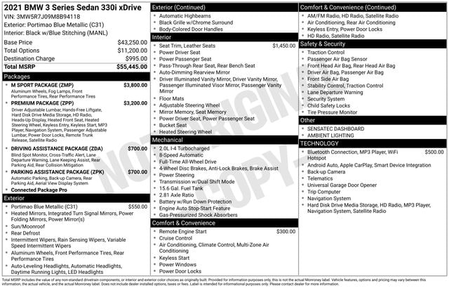 2021 BMW 3 Series 330i xDrive NAVIGATION, SUNROOF, LEATHER, BLUETOOTH, BACK UP CAMERA, HEATED SEATS, SATELLITE RADIO, ALL WHEEL DRIVE, APPLE CAR PLAY, SERVICE RECORDS AVAILABLE, Active Blind Spot Detection, Connected Package Pro, Navigation, Navigation System, Power moonroof.
