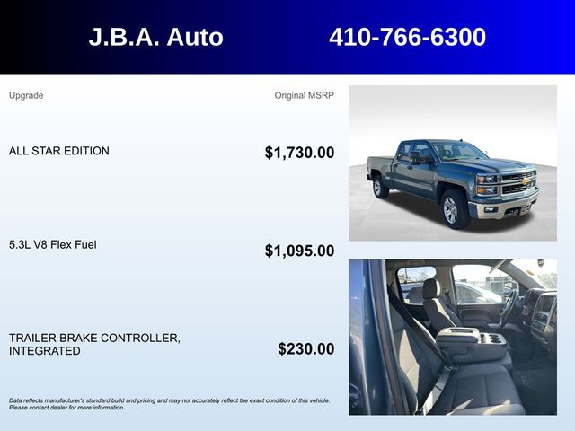 2014 Chevrolet Silverado 1500 LT BLUETOOTH, BACK UP CAMERA, SATELLITE RADIO, BEDLINER, FOUR WHEEL DRIVE, CLEAN VEHICLE HISTORY REPORT, SERVICE RECORDS AVAILABLE, 110-Volt AC Power Outlet, 150 Amp Alternator, 4.2" Diagonal Color Display Driver Info Center, 6 Speaker Audio System, All Star Edition, Alloy wheels, AM/FM radio: SiriusXM, Black Power Adjustable Heated Outside Mirrors, Bluetooth® For Phone, Chrome Grille Surround, Color-Keyed Carpeting w/Rubberized Vinyl Floor Mats, Deep-Tinted Glass, Driver & Front Passenger Illuminated Vanity Mirrors, Dual-Zone Automatic Climate Control, Electric Rear-Window Defogger, EZ Lift & Lower Tailgate, Front Chrome Bumper, Front Frame-Mounted Black Recovery Hooks, Front Halogen Fog Lamps, Heavy-Duty Rear Locking Differential, Hill Descent Control, Leather Wrapped Steering Wheel w/Cruise Controls, Manual Tilt Wheel Steering Column, Off-Road Suspension Package, OnStar 6 Months Directions & Connections Plan, Power Windows w/Driver Express Up, Preferred Equipment Group 2LT, Radio: AM/FM 8" Diagonal Color Touch Screen, Rear 60/40 Folding Bench Seat (Folds Up), Rear Chrome Bumper, Rear Vision Camera w/Dynamic Guide Lines, Rear Wheelhouse Liners, Remote Keyless Entry, Remote Vehicle Starter System, Single Slot CD/MP3 Player, SiriusXM Satellite & HD Radio, Steering Wheel Audio Controls, Trailering Equipment.