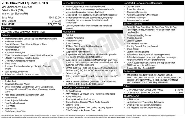 2015 Chevrolet Equinox LS ONE OWNER, BLUETOOTH, BACK UP CAMERA, SATELLITE RADIO, SERVICE RECORDS AVAILABLE, Alloy wheels, AM/FM radio: SiriusXM, Equipment Group 1LS, Power driver seat.