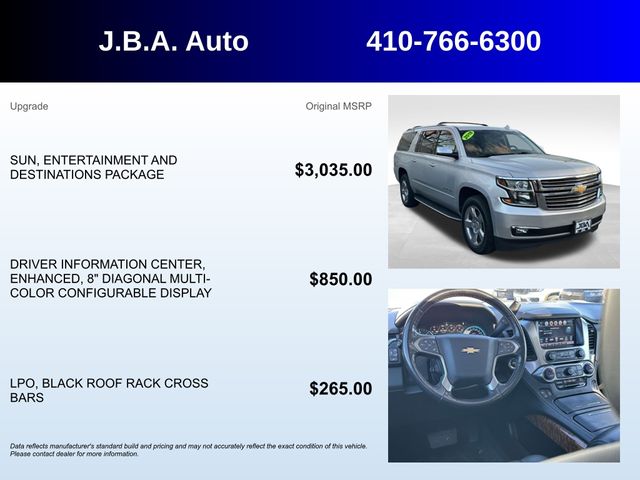 2018 Chevrolet Suburban Premier NAVIGATION, SUNROOF, LEATHER, ONE OWNER, BLUETOOTH, BACK UP CAMERA, HEATED AND COOLED SEATS, SATELLITE RADIO, ONSTAR NAVIGATION, THIRD ROW SEAT, SERVICE RECORDS AVAILABLE, 12-Volt Auxiliary Power Outlet (5), 1st & 2nd Row Color-Keyed Carpeted Floor Mats, 3rd Row 60/40 Power Fold Split-Bench, 4-Wheel Antilock Disc Brakes, 6-Way Power Front Passenger Seat Adjuster, Alloy wheels, AM/FM radio: SiriusXM, Auto-Dimming Inside Rear-View Mirror, Black Assist Steps, Color-Keyed Carpeting Floor Covering, Driver Inboard & Front Passenger Airbags, Electronic Cruise Control w/Set & Resume Speed, Enhanced Driver Alert Package, Floor Console w/Storage Area, Fog Lamps, Forward Collision Alert, Front & Rear Park Assist, Hands Free Power Liftgate, HD Radio, Head-Up Display, Heated 2nd Row Outboard Seats, Heated Leather Wrapped Steering Wheel, Intellibeam Headlamps w/Automatic High Beam On/Off, Lane Change Alert w/Side Blind Zone Alert, Lane Keep Assist w/Lane Departure Warning, License Plate Front Mounting Package, Low Speed Forward Automatic Braking, Magnetic Ride Control Suspension Package, Memory Settings, Navigation System, OnStar Basic Plan For 5 Years, Passive Entry System, Power Folding & Adjustable Heated Outside Mirrors, Power Release 2nd Row Bucket Seats, Power Tilt & Telescoping Steering Column, Power Tilt-Sliding Sunroof w/Express-Open/Close, Power-Adjustable Accelerator & Brake Pedals, Preferred Equipment Group 1LZ, Push Button Keyless Start, Rear Cross-Traffic Alert, Rear Seat Entertainment System, Remote Vehicle Start, Roof-Mounted Luggage Rack Side Rails, Safety Alert Seat, SiriusXM Satellite Radio, Sun, Entertainment & Destinations Package, Universal Home Remote, Wireless Charging.