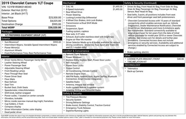 2019 Chevrolet Camaro 1LT SUNROOF, ONE OWNER, BLUETOOTH, BACK UP CAMERA, SATELLITE RADIO, ONSTAR NAVIGATION, CLEAN VEHICLE HISTORY REPORT, APPLE CAR PLAY, SERVICE RECORDS AVAILABLE, Alloy wheels, AM/FM radio: SiriusXM, Front Bucket Seats, Power Sunroof, Preferred Equipment Group 1LT, SiriusXM Radio.