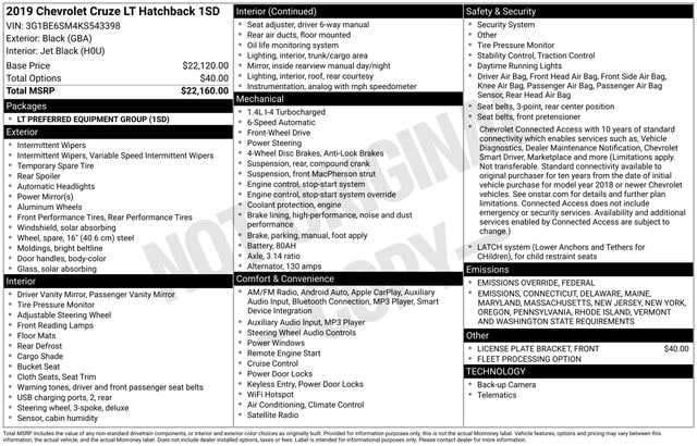 2019 Chevrolet Cruze LT BLUETOOTH, BACK UP CAMERA, REMOTE START, SERVICE RECORDS AVAILABLE, Alloy wheels, AM/FM radio: SiriusXM, Driver 6-Way Manual Seat Adjuster, Front Bucket Seats, SiriusXM Radio.
