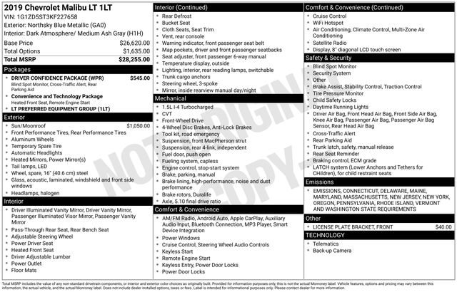 2019 Chevrolet Malibu LT SUNROOF, ONE OWNER, BLUETOOTH, BACK UP CAMERA, SATELLITE RADIO, APPLE CAR PLAY, SERVICE RECORDS AVAILABLE, 8-Way Power Driver Seat Adjuster, Alloy wheels, AM/FM radio: SiriusXM, Driver Confidence Package, Front Bucket Seats, Heated Driver & Front Passenger Seats, Power Tilt-Sliding Sunroof, Preferred Equipment Group 1LT, Rear Cross Traffic Alert, Rear Park Assist, Side Blind Zone Alert w/Lane Change Alert.