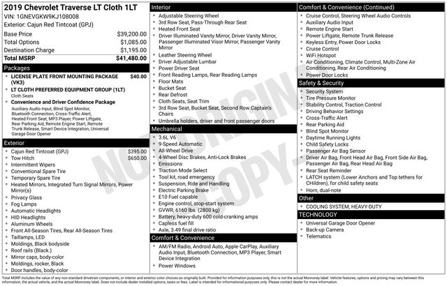 2019 Chevrolet Traverse LT ONE OWNER, TOW PACKAGE, BLUETOOTH, BACK UP CAMERA, SATELLITE RADIO, ALL WHEEL DRIVE, ONSTAR NAVIGATION, APPLE CAR PLAY, SERVICE RECORDS AVAILABLE, 3rd row seats: split-bench, 7-Passenger Seating (2-2-3 Seating Configuration), Alloy wheels, AM/FM radio: SiriusXM, Front Bucket Seats, Heavy-Duty Cooling System, Power Liftgate, Preferred Equipment Group 1LT, Trailering Equipment.