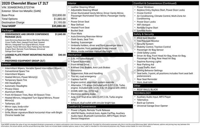 2020 Chevrolet Blazer LT BLUETOOTH, BACK UP CAMERA, SATELLITE RADIO, ONSTAR NAVIGATION, CLEAN VEHICLE HISTORY REPORT, SERVICE RECORDS AVAILABLE, Alloy wheels, AM/FM radio: SiriusXM, Black Roof Rails, Convenience & Driver Confidence Package, Front Bucket Seats, Heated Driver & Front Passenger Seats, Inside Rear-View Auto-Dimming Mirror, Lane Change Alert w/Side Blind Zone Alert, Outside Heated Power-Adjustable Body-Color Mirrors, Preferred Equipment Group 2LT, Rear Cross Traffic Alert, Rear Park Assist w/Audible Warning, Rear Power Programmable Liftgate, Remote Start, SiriusXM Radio, Universal Home Remote.
