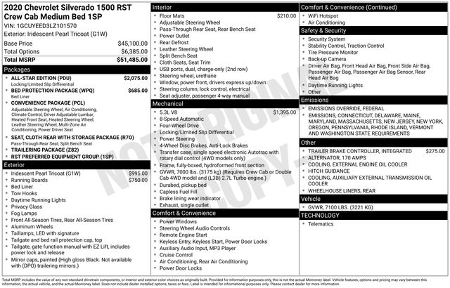 2020 Chevrolet Silverado 1500 RST ONE OWNER, TOW PACKAGE, BLUETOOTH, BACK UP CAMERA, HEATED SEATS, SATELLITE RADIO, ONSTAR NAVIGATION, BEDLINER, FOUR WHEEL DRIVE, REMOTE START, APPLE CAR PLAY, SERVICE RECORDS AVAILABLE, RUNNING BOARDS, 12-Volt Rear Auxiliary Power Outlet, 2 USB Ports (First Row), 4-Way Manual Driver Seat Adjuster, 4.2" Diagonal Color Display Driver Info Center, 6-Speaker Audio System, All-Star Edition, Alloy wheels, Bed Protection Package, Bluetooth® For Phone, Body Color Grille, Chevytec Spray-On Black Bedliner, Cloth Rear Seat w/Storage Package, Color-Keyed Carpeting Floor Covering, Compass, Convenience Package, Deep-Tinted Glass, Electric Rear-Window Defogger, Electrical Lock Control Steering Column, Front Frame-Mounted Black Recovery Hooks, Front LED Fog Lamps, Front Rubberized Vinyl Floor Mats, Heated Driver & Front Outboard Passenger Seats, Heavy-Duty Rear Locking Differential, High Gloss Black Mirror Caps, Keyless Open & Start, LED Cargo Area Lighting, Manual Tilt-Wheel Steering Column, OnStar & Chevrolet Connected Services Capable, Power Door Locks, Power Front Windows w/Driver Express Up/Down, Power Front Windows w/Passenger Express Down, Power Rear Windows w/Express Down, Preferred Equipment Group 1SP, Rear 60/40 Folding Bench Seat (Folds Up), Rear Dual USB Charging-Only Ports, Rear Rubberized-Vinyl Floor Mats, Rear Vision Camera, Rear Wheelhouse Liners, Remote Vehicle Starter System, Single-Zone Manual/Semi-Automatic Air Conditioning, Steering Wheel Audio Controls, Steering Wheel Mounted Electronic Cruise Control, Theft Deterrent System (Unauthorized Entry), Trailering Package, Urethane Steering Wheel.
