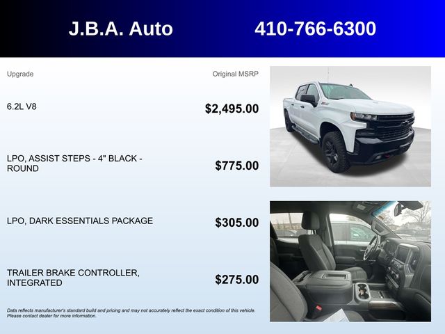 2021 Chevrolet Silverado 1500 LT Trail Boss ONE OWNER, BLUETOOTH, BACK UP CAMERA, HEATED SEATS, SATELLITE RADIO, ONSTAR NAVIGATION, BEDLINER, FOUR WHEEL DRIVE, REMOTE START, BOSE STEREO, HEATED STEERING WHEEL, APPLE CAR PLAY, SERVICE RECORDS AVAILABLE, 10-Way Power Driver Seat w/Lumbar, 12-Volt Rear Auxiliary Power Outlet, 170 Amp Alternator, 2 USB Ports (First Row), 4.2" Diagonal Color Display Driver Info Center, 6-Speaker Audio System, All-Weather Floor Liner (LPO) (AAK), Alloy wheels, AM/FM radio: SiriusXM, Auto-Locking Rear Differential, Auxiliary External Transmission Oil Cooler, Black Name Plates (LPO), Bluetooth® For Phone, Cloth Rear Seat w/Storage Package, Color-Keyed Carpeting Floor Covering, Compass, Convenience Package w/Buckets Seats, Dark Essentials Package (LPO), Deep-Tinted Glass, Dual Exhaust w/Polished Outlets, Dual-Zone Automatic Climate Control, Electric Rear-Window Defogger, Electrical Lock Control Steering Column, Electronic Cruise Control, EZ Lift Power Lock & Release Tailgate, Floor Mounted Center Console, Front LED Fog Lamps, Heated Driver & Front Outboard Passenger Seats, Heated Steering Wheel, High Gloss Black Grille, High Gloss Black Mirror Caps, Hitch Guidance, Keyless Open & Start, Leather Wrapped Steering Wheel, LED Cargo Area Lighting, LED Reflector Headlamps, Manual Tilt/Telescoping Steering Column, OnStar & Chevrolet Connected Services Capable, Performance Red Recovery Hooks, Power Door Locks, Power Front Windows w/Driver Express Up/Down, Power Front Windows w/Passenger Express Down, Power Rear Windows w/Express Down, Preferred Equipment Group 2LT, Rear Dual USB Charging-Only Ports, Rear Vision Camera, Remote Vehicle Starter System, SiriusXM Radio, Standard Tailgate, Steering Wheel Audio Controls, Suspension Package, Theft Deterrent System (Unauthorized Entry), Trailering Package.