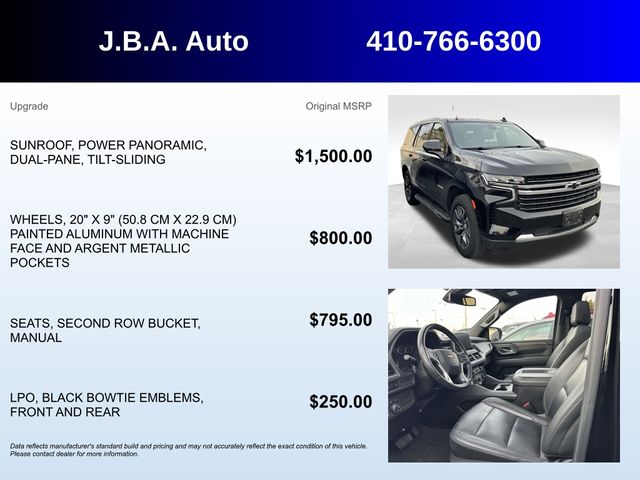 2021 Chevrolet Tahoe LT NAVIGATION, SUNROOF, LEATHER, ONE OWNER, BLUETOOTH, BACK UP CAMERA, HEATED SEATS, SATELLITE RADIO, ONSTAR NAVIGATION, THIRD ROW SEAT, FOUR WHEEL DRIVE, REMOTE START, APPLE CAR PLAY, SERVICE RECORDS AVAILABLE, 1st & 2nd Row Color-Keyed Carpeted Floor Mats, 2 USB Data Ports, Alloy wheels, AM/FM radio: SiriusXM with 360L, Auto High-beam Headlights, Auto-Dimming Inside Rear-View Mirror, Bright Front & Rear Door Sill Plates, Color-Keyed Carpeting Floor Covering, Driver & Front Outboard Passenger Airbags, Dual-Pane Power Panoramic Sunroof, Floor Console w/Storage Area, Front Bucket Seats, Hands-Free Rear Power Programmable Liftgate, HD Radio, Infotainment Display, Leather-Wrapped Steering Wheel, LED Daytime Running Lamps, Memory Settings for Driver, Power Liftgate, Preferred Equipment Group 1LT, Rain sensing wipers, Remote Start, SiriusXM Radio w/360L, Universal Home Remote.