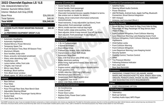 2022 Chevrolet Equinox LS ONE OWNER, BLUETOOTH, BACK UP CAMERA, GM CERTIFIED WARRANTY AVAILABLE, SATELLITE RADIO, ONSTAR NAVIGATION, CLEAN VEHICLE HISTORY REPORT, APPLE CAR PLAY, SERVICE RECORDS AVAILABLE, Alloy wheels, AM/FM radio: SiriusXM, Front Bucket Seats, Preferred Equipment Group 1LS.