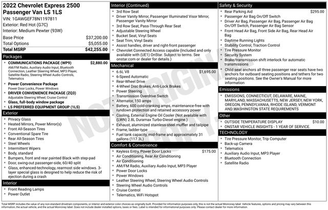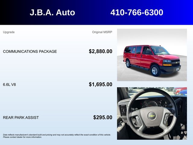 2022 Chevrolet Express 2500 LS ONE OWNER, BLUETOOTH, BACK UP CAMERA, CLEAN VEHICLE HISTORY REPORT, SERVICE RECORDS AVAILABLE, 1 Year of OnStar Vehicle Insights Service, 12-Passenger Seating (2-3-3-4 Seating Config), 3rd row seats: bench, 4th-Row Bench Seat, Bluetooth® For Phone, Communications Package, Cruise Control, Driver Convenience Package, Driver's Seat Mounted Armrest, Front Bucket Seats, Leather-Wrapped Steering Wheel, Preferred Equipment Group 1LS, Radio: AM/FM Stereo w/MP3 Player/Seek & Scan, SiriusXM Radio.