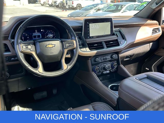 2022 Chevrolet Tahoe High Country NAVIGATION, SUNROOF, LEATHER, ONE OWNER, BLUETOOTH, BACK UP CAMERA, HEATED AND COOLED SEATS, GM CERTIFIED WARRANTY AVAILABLE, SATELLITE RADIO, ONSTAR NAVIGATION, THIRD ROW SEAT, FOUR WHEEL DRIVE, CLEAN VEHICLE HISTORY REPORT, BLIND SPOT MONITOR, REMOTE START, BOSE STEREO, POWER LIFT GATE, ADJUSTABLE PEDALS, HEATED STEERING WHEEL, HEAD UP DISPLAY, APPLE CAR PLAY, SERVICE RECORDS AVAILABLE, 15" Diagonal Multi-Color Head-Up Display, 1st & 2nd Row Color-Keyed Carpeted Floor Mats, 2-Speed Active Electronic AutoTrac Transfer Case, 3rd Row 60/40 Power-Folding Split-Bench Seat, Adaptive suspension, Alloy wheels, Auto-leveling suspension, Automatic Stop/Start, Bose 10-Speaker Centerpoint Surround Audio Sys Ft, Bright Front & Rear Door Sill Plates, Chrome Door Handles w/Body-Color Strip, Color-Keyed Carpeting Floor Covering, Driver & Front Outboard Passenger Airbags, Dual Exhaust System, Dual-Pane Power Panoramic Sunroof, Enhanced Driver Information Center, Floor Console, Hands-Free Rear Power Programmable Liftgate, HD Surround Vision, Heated 2nd Row Outboard Seats, Heated Steering Wheel, Hill Descent Control, Infotainment Display, Inside Rearview Auto-Dimming Rear Camera Mirror, Lane Change Alert w/Side Blind Zone Alert, Leather-Wrapped Steering Wheel, LED Daytime Running Lamps, Memory Settings, Navigation System, Outside Heated Power-Adjustable Mirrors, Power Release 2nd Row Bucket Seats, Power Tilt & Telescopic Steering Column, Preferred Equipment Group 3LZ, Rain sensing wipers, Rear Camera Mirror Washer, Rear Cross Traffic Alert, Rear Pedestrian Alert, Remote Start, Safety Alert Seat, SiriusXM Radio w/360L, Start/Stop System Disable Button, Universal Home Remote, Wireless Charging.
