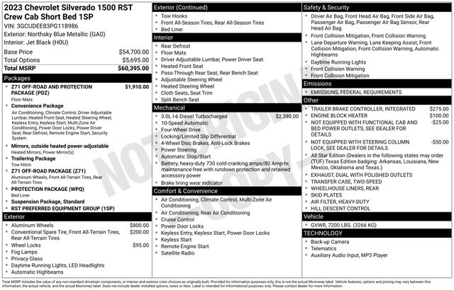 2023 Chevrolet Silverado 1500 RST ONE OWNER, BLUETOOTH, BACK UP CAMERA, GM CERTIFIED WARRANTY AVAILABLE, SATELLITE RADIO, ONSTAR NAVIGATION, BEDLINER, FOUR WHEEL DRIVE, CLEAN VEHICLE HISTORY REPORT, APPLE CAR PLAY, SERVICE RECORDS AVAILABLE, 10-Way Power Driver Seat w/Lumbar, 12.3" Multicolor Reconfigurable Digital Display, 120-Volt Instrument Panel Power Outlet, 6-Speaker Audio System, All-Star Edition, All-Weather Floor Liner (LPO) (AAK), Alloy wheels, Auto High-beam Headlights, Auto-Locking Rear Differential, Bluetooth® For Phone, Chevytec Spray-On Black Bedliner, Color-Keyed Carpeting Floor Covering, Compass, Convenience Package, Deep-Tinted Glass, Dual Rear USB Ports (Charge Only), Dual-Zone Automatic Climate Control, Electric Rear-Window Defogger, Electrical Steering Column Lock, Electronic Cruise Control, EZ Lift Power Lock & Release Tailgate, Front Frame-Mounted Black Recovery Hooks, Front LED Fog Lamps, Front Rubberized Vinyl Floor Mats, HD Rear Vision Camera, Heated Driver & Front Outboard Passenger Seats, Heated Power-Adjustable Outside Mirrors, Heated Steering Wheel, High Capacity Suspension Package, High Gloss Black Mirror Caps, Inside Rear-View Mirror w/Tilt, Keyless Open & Start, LED Cargo Area Lighting, OnStar & Chevrolet Connected Services Capable, Power Front Windows w/Driver Express Up/Down, Power Front Windows w/Passenger Express Down, Power Rear Windows w/Express Down, Preferred Equipment Group 1SP, Protection Package, Rear 60/40 Folding Bench Seat (Folds Up), Rear Rubberized-Vinyl Floor Mats, Rear Wheelhouse Liners, Remote Vehicle Starter System, SiriusXM w/360L, Standard Suspension Package, Standard Tailgate, Steering Wheel Audio Controls, Theft Deterrent System (Unauthorized Entry), Trailering Package, Wireless Phone Projection, Wrapped Steering Wheel, Z71 Off-Road & Protection Package, Z71 Off-Road Package.