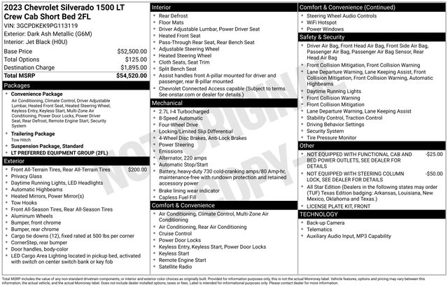 2023 Chevrolet Silverado 1500 LT ONE OWNER, BLUETOOTH, BACK UP CAMERA, HEATED SEATS, GM CERTIFIED WARRANTY AVAILABLE, SATELLITE RADIO, BEDLINER, FOUR WHEEL DRIVE, CLEAN VEHICLE HISTORY REPORT, REMOTE START, APPLE CAR PLAY, SERVICE RECORDS AVAILABLE, 10-Way Power Driver Seat w/Lumbar, 120-Volt Instrument Panel Power Outlet, Alloy wheels, AM/FM radio: SiriusXM with 360L, Auto High-beam Headlights, Convenience Package, Dual Rear USB Ports (Charge Only), Dual-Zone Automatic Climate Control, Heated Driver & Front Outboard Passenger Seats, Heated Steering Wheel, Hitch Guidance, Keyless Open & Start, Standard Suspension Package, Trailering Package, Wrapped Steering Wheel.