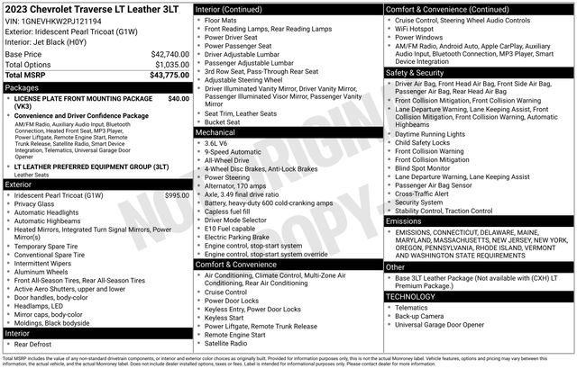 2023 Chevrolet Traverse LT Leather NAVIGATION, LEATHER, BLUETOOTH, BACK UP CAMERA, HEATED SEATS, GM CERTIFIED WARRANTY AVAILABLE, SATELLITE RADIO, ALL WHEEL DRIVE, ONSTAR NAVIGATION, THIRD ROW SEAT, CLEAN VEHICLE HISTORY REPORT, REMOTE START, APPLE CAR PLAY, SERVICE RECORDS AVAILABLE, Alloy wheels, AM/FM radio: SiriusXM with 360L, Heated Driver & Front Passenger Seats, Power Liftgate, Preferred Equipment Group 3LT, SiriusXM w/360L.