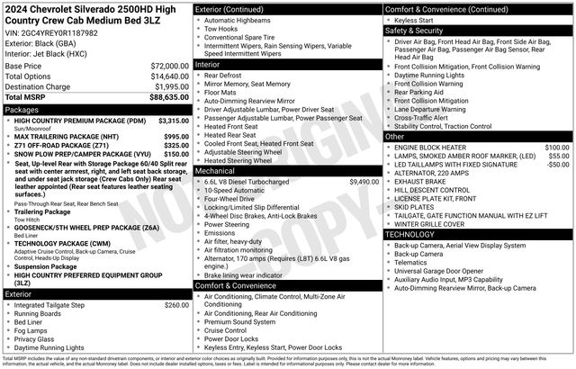 2024 Chevrolet Silverado 2500HD High Country NAVIGATION, SUNROOF, LEATHER, Z71 OFFROAD PACKAGE, ONE OWNER, TOW PACKAGE, BLUETOOTH, BACK UP CAMERA, HEATED AND COOLED SEATS, GM CERTIFIED WARRANTY AVAILABLE, SATELLITE RADIO, ONSTAR NAVIGATION, BEDLINER, FOUR WHEEL DRIVE, CLEAN VEHICLE HISTORY REPORT, REMOTE START, BOSE STEREO, HEATED STEERING WHEEL, HEAD UP DISPLAY, APPLE CAR PLAY, SERVICE RECORDS AVAILABLE, 120-Volt Bed Mounted Power Outlet, 120-Volt Interior Power Outlet, 170 Amp Alternator, 220 Amp Alternator, 6" Rectangular Chromed Tubular Assist Steps, Alloy wheels, AM/FM radio: SiriusXM with 360L, Auto-Dimming Inside Rear-View Mirror, Bed View Camera w/2 Trailer Camera Provisions, Black Chevytec Spray-On Bedliner, Bluetooth® For Phone, BOSE Premium 7-Speaker Sound System, Chevrolet Connected Access Capable, Chrome Door Handles, Chrome Mirror Caps, Color-Keyed Carpeting Floor Covering, Compass, Deep-Tinted Glass, Electric Rear-Window Defogger, Electronic Cruise Control w/Set & Resume Speed, Front Carpeted Floor Mats, Front Chrome Recovery Hooks, Front LED Fog Lamps, Front Rain-Sensing Wipers, Gooseneck/5th Wheel Prep Package, Heated 2nd Row Outboard Seats, Heated Steering Wheel, High Country Premium Package, Hill Descent Control, Hitch Guidance w/Hitch View, In-Vehicle Trailering App System, Keyless Open & Start, LED Cargo Area Lighting, Manual Tilt & Telescoping Steering Column, Max Trailering Package, Off-Road Suspension, OnStar & Chevrolet Connected Services Capable, Polished Exhaust Tip, Power Door Locks, Power Front Windows w/Driver Express Up/Down, Power Front Windows w/Passenger Express Up/Down, Power Rear Windows w/Express Down, Power Sliding Rear Window w/Defogger, Power Sunroof, Preferred Equipment Group 3LZ, Push Button Start, Pwr Up/Down Tailgate Function w/Pwr Lock & Release, Rear Carpeted Floor Mats, Rear Cross Traffic Alert, Rear Wheelhouse Liners, Remote Vehicle Starter System, SiriusXM w/360L, Snow Plow Prep/Camper Package, Standard Tailgate, Steering Wheel Audio Controls, Suspension Package, Technology Package, Trailer Camera Provisions, Ultrasonic Front & Rear Park Assist, Unauthorized Entry Theft-Deterrent System, Universal Home Remote, Up-Level Rear Seat w/Storage Package, Wi-Fi Hotspot Capable, Wireless Charging, Wireless Phone Projection, Wrapped Steering Wheel, Z71 Off-Road Package.