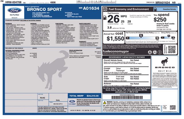 2021 Ford Bronco Sport Outer Banks TOW PACKAGE, BLUETOOTH, BACK UP CAMERA, FOUR WHEEL DRIVE, CLEAN VEHICLE HISTORY REPORT, APPLE CAR PLAY, SERVICE RECORDS AVAILABLE, Alloy wheels, AM/FM radio: SiriusXM, Class II Trailer Tow Package w/Trailer Sway Control, Equipment Group 300A, Front Bucket Seats, Heated front seats.