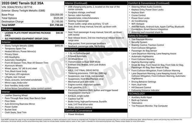 2020 GMC Terrain SLE ONE OWNER, BLUETOOTH, BACK UP CAMERA, ALL WHEEL DRIVE, ONSTAR NAVIGATION, CLEAN VEHICLE HISTORY REPORT, APPLE CAR PLAY, SERVICE RECORDS AVAILABLE, Alloy wheels, Auto High-beam Headlights, Exterior Parking Camera Rear, Lane Departure Warning System, Preferred Equipment Group 3SA.