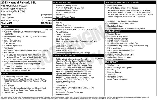 2023 Hyundai Palisade SEL NAVIGATION, SUNROOF, LEATHER, ONE OWNER, BLUETOOTH, BACK UP CAMERA, HEATED AND COOLED SEATS, SATELLITE RADIO, ALL WHEEL DRIVE, CLEAN VEHICLE HISTORY REPORT, APPLE CAR PLAY, SERVICE RECORDS AVAILABLE, 8-Passenger Bench Seating, AM/FM radio: SiriusXM, Blind-Spot View Monitor, Forward Collision Avoidance Assist, H-Tex Leatherette Seat Trim, harman/kardon® Audio System, Heated Steering Wheel, Navigation System, Option Group 02, Option Group 03, Power Liftgate, Power Sunroof, Premium Package.