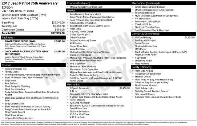 2017 Jeep Patriot 75th Anniversary Edition SUNROOF, ONE OWNER, BLUETOOTH, FOUR WHEEL DRIVE, SERVICE RECORDS AVAILABLE, 4x4 Bronze Badge, 75th Anniversary Badge, AM/FM radio: SiriusXM, Automatic Headlamps, Body Color Door Handles, Body Color Liftgate Applique, Bronze Fascia Applique, Bronze Liftgate Applique, Bronze Patriot Badge, Bronze Roof Rails, Bronze Tow Hooks, Front Bucket Seats, Illuminated Entry, Jeep 75th Anniversary Package, Jeep Bronze Badging, Keyless Entry, Leather Wrapped Steering Wheel, Moroccan Sun Interior Accents, Ombre Mesh Bucket Seats (DISC), Power Driver 1-Touch Windows, Power Express Open/Close Sunroof, Power Heated Fold-Away Mirrors, Power Value Group, Quick Order Package 2GK 75th Anniv Edition (DISC), Remote Start System, Soft Tonneau Cover, Speed Sensitive Power Locks, Steering Wheel Mounted Audio Controls, Tangerine Interior Accents, Wheels: 17" x 6.5" Bronze Aluminum (DISC).