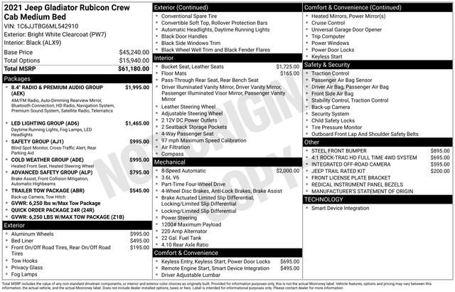 2021 Jeep Gladiator Rubicon NAVIGATION, LEATHER, BLUETOOTH, BACK UP CAMERA, HEATED SEATS, SATELLITE RADIO, FOUR WHEEL DRIVE, REMOTE START, HEATED STEERING WHEEL, APPLE CAR PLAY, SERVICE RECORDS AVAILABLE, 1-Year SiriusXM Guardian Trial, 240 Amp Alternator, 5-Year SiriusXM Traffic Service, 5-Year SiriusXM Travel Link Service, 8.4" Radio & Premium Audio Group, 8.4" Touchscreen Display, Advanced Brake Assist, Advanced Safety Group, Alloy wheels, Alpine Premium Audio System, Auto High Beam Headlamp Control, Auto-Dimming Rear-View Mirror, Blind Spot & Cross Path Detection, Class IV Hitch Receiver, Cold Weather Group, Daytime Running Lamps LED Accents, Emergency/Assistance Call, For Details, Visit DriveUconnect.com, Front LED Fog Lamps, Full Speed Forward Collision Warning Plus, GPS Navigation, GVWR: 6,250 lbs w/Max Tow Package, HD Radio, Heated Front Seats, Heated Steering Wheel, Heavy-Duty Engine Cooling, LED Lighting Group, LED Park Turn Lamps, LED Premium Reflector Headlamps, LED Taillamps, ParkSense Rear Park Assist System, Quick Order Package 24R, Radio: Uconnect 4C Nav w/8.4" Display, Safety Group, SiriusXM Traffic Plus, SiriusXM Travel Link, Trailer Hitch Zoom, Trailer Tow Package.