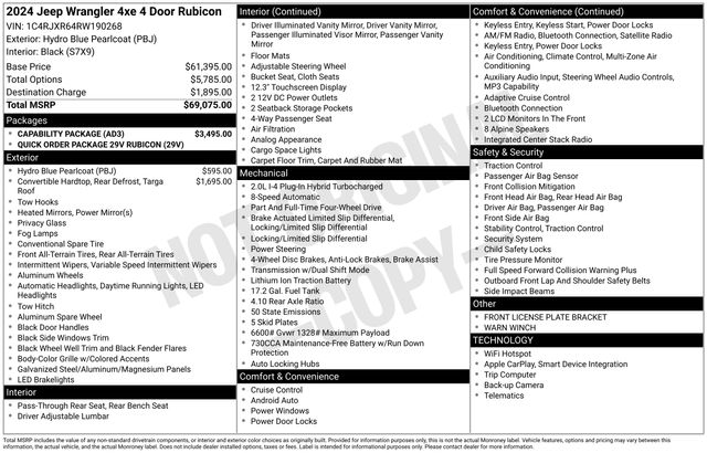 2024 Jeep Wrangler Rubicon 4xe ONE OWNER, BLUETOOTH, BACK UP CAMERA, SATELLITE RADIO, FOUR WHEEL DRIVE, CLEAN VEHICLE HISTORY REPORT, APPLE CAR PLAY, SERVICE RECORDS AVAILABLE, Alloy wheels, AM/FM radio: SiriusXM, Body Color 3-Piece Hard Top, Capability Package, Front Bucket Seats, Performance Suspension, Quick Order Package 29V Rubicon, Steel Front Bumper, Steel Rear Bumper, Warn Winch.