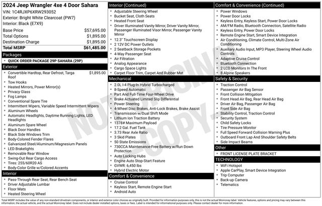 2024 Jeep Wrangler Sahara 4xe ONE OWNER, BLUETOOTH, BACK UP CAMERA, SATELLITE RADIO, FOUR WHEEL DRIVE, CLEAN VEHICLE HISTORY REPORT, APPLE CAR PLAY, Alloy wheels, AM/FM radio: SiriusXM, Body Color 3-Piece Hard Top, Freedom Panel Storage Bag, No Soft Top, Quick Order Package 29P Sahara, Rear Window Defroster, Rear Window Wiper/Washer.
