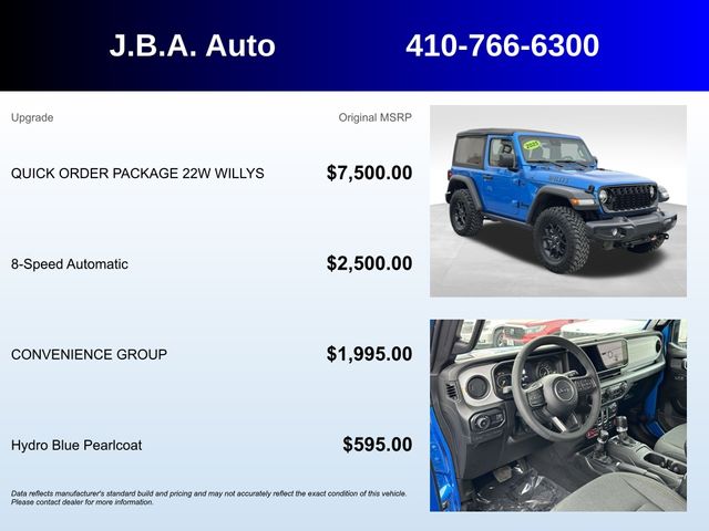 2025 Jeep Wrangler Willys ONE OWNER, BLUETOOTH, BACK UP CAMERA, SATELLITE RADIO, FOUR WHEEL DRIVE, CLEAN VEHICLE HISTORY REPORT, APPLE CAR PLAY, SERVICE RECORDS AVAILABLE, 2-Door Passive Entry, Front Door Locks, 4-Wheel Drive Swing Gate Decal, 4.10 Rear Axle Ratio, 7 & 4 Pin Wiring Harness, 97 MPH Vehicle Max Speed Calibration, Advanced Brake Assist, Air Conditioning w/Auto Temperature Control, Air Filtering, AM/FM radio: SiriusXM, Automatic Headlamps, Auxiliary Switches, Black Grille, Class II Receiver Hitch, Cluster 7.0" TFT Color Display, Convenience Group, Conventional Differential Front Axle, Corning Gorilla Glass, Dana M210 Wide HD Tube Front Axle, Dana M220 Wide Rear Axle, Daytime Running Lamps LED Accents, Deep Tint Sunscreen Windows, E-Locker Rear Axle, Emergency/Assistance Call, Enhanced Adaptive Cruise Control, Front LED Fog Lamps, Full Speed Forward Collision Warning Plus, Heated Front Seats, Heated Steering Wheel, Injection Molded Black Rear Bumper, LED Premium Reflector Headlamps, Mold In Color Bumper w/Gloss Black, Molded in Color Rubicon Highline Flare, MOPAR All-Weather Floor Mats, Off-Road Plus Mode, Power Heated Mirrors, Premium Wrapped Steering Wheel, Quick Order Package 22W Willys, Quick Order Package 23W Willys, Remote Start System, Security Alarm, Sun Visors w/Illuminated Vanity Mirrors, Universal Garage Door Opener, Wheels: 17" x 7.5" Black Steel Styled, Wheels: 17" x 7.5" Painted Black, Willy's Suspension, Willys Hood Decal.
