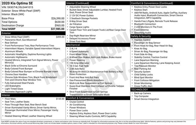 2020 Kia Optima SE SUNROOF, LEATHER, ONE OWNER, BLUETOOTH, BACK UP CAMERA, HEATED SEATS, CLEAN VEHICLE HISTORY REPORT, Heated front seats, Leather Seat Trim, Power moonroof.