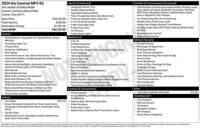 2024 Kia Carnival EX ONE OWNER, BLUETOOTH, BACK UP CAMERA, HEATED SEATS, SATELLITE RADIO, APPLE CAR PLAY, SERVICE RECORDS AVAILABLE, KIA CERTIFICATION AVAILABLE, Alloy wheels, AM/FM radio: SiriusXM, Front Bucket Seats, Front Center Armrest, Heated Front Bucket Seats, Navigation System.