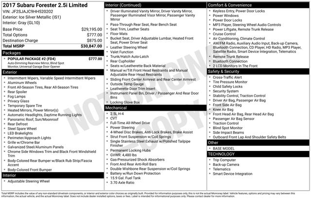 2017 Subaru Forester 2.5i Limited SUNROOF, LEATHER, BLUETOOTH, BACK UP CAMERA, ALL WHEEL DRIVE, SERVICE RECORDS AVAILABLE, Alloy wheels, AM/FM radio: SiriusXM, Auto-Dimming Mirror w/Compass & HomeLink, Exterior Auto-Dimming Mirror w/Approach Light, Front Bucket Seats, Heated Front Bucket Seats, Heated front seats, Perforated Leather-Trimmed Upholstery, Popular Package #2, Power driver seat, Power moonroof, Rear Bumper Cover, Rear Seat Back Cargo Net.