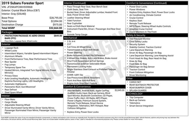 2019 Subaru Forester Sport SUNROOF, BLUETOOTH, BACK UP CAMERA, HEATED SEATS, ALL WHEEL DRIVE, CLEAN VEHICLE HISTORY REPORT, APPLE CAR PLAY, SERVICE RECORDS AVAILABLE, Aero Crossbar Set, All-Weather Floor Liners, Alloy Wheel Locks, Alloy wheels, AM/FM radio: SiriusXM, Blind Spot Detection w/Rear Cross Traffic Alert, BSD & Rev Auto Brake & harman kardon & Pwr Rr Gate, Cargo Net, Front Bucket Seats, harman kardon 576W Amp & Speaker System, Heated Front Bucket Seats, Power moonroof: Panoramic, Power Rear Gate, Protection Package #3 Aero Cross Bars, Radio: Subaru Starlink 8.0" Multimedia Plus System, Rear Bumper Cover, Rear Seatback Protector, Reverse Automatic Braking System (RAB), Splash Guards.