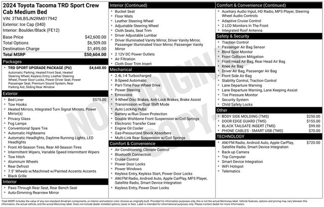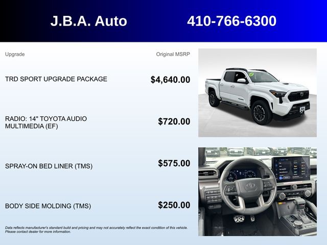 2024 Toyota Tacoma TRD Sport ONE OWNER, BLUETOOTH, BACK UP CAMERA, HEATED SEATS, SATELLITE RADIO, BEDLINER, FOUR WHEEL DRIVE, CLEAN VEHICLE HISTORY REPORT, APPLE CAR PLAY, SERVICE RECORDS AVAILABLE, 8-Way Power Driver & Passenger Seat Adjusters, ABS brakes, Alloy wheels, AM/FM radio: SiriusXM, Auto High-beam Headlights, Deck DC Power Pre-wire, Digital Key Capability, Electronic Stability Control, Front & Rear Parking Assist w/Automatic Braking, Heated door mirrors, Heated Front Seats, Heated Leather-Trimmed Steering Wheel, Illuminated entry, Integrated Trailer Brake Controller, JBL Premium Audio, Low tire pressure warning, Power Horizontal Rear Window, Pre-Wired Auxiliary Switches, Qi-Compatible Wireless Charging, Radio: 14" Toyota Audio Multimedia, Remote keyless entry, Traction control, TRD Sport Upgrade Package.